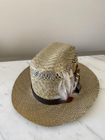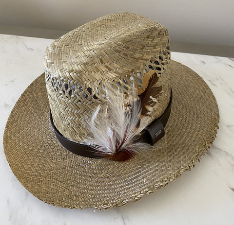 NWT $895 Saint Laurent Straw Cowboy Hat With Leather and Feathers Brown M