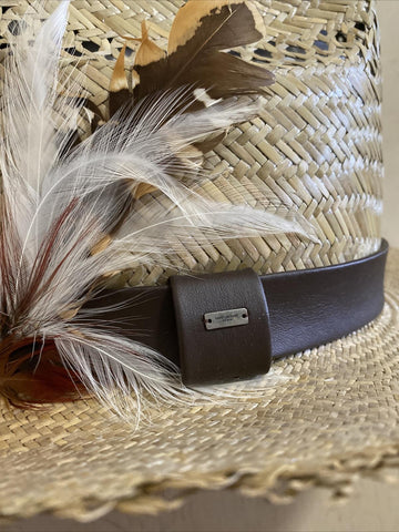 NWT $895 Saint Laurent Straw Cowboy Hat With Leather and Feathers Brown XL